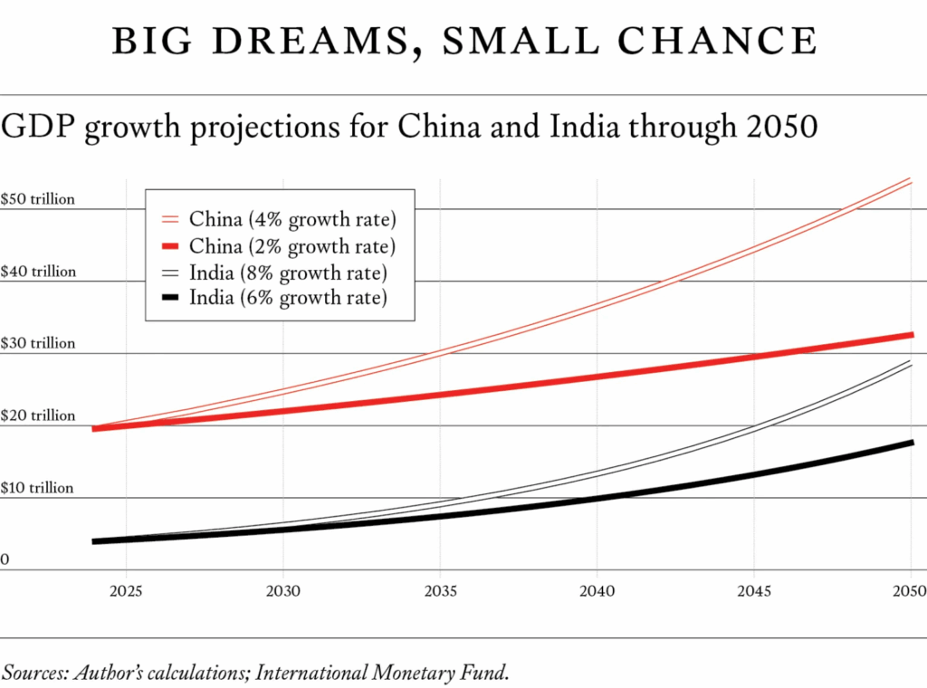 India will therefore likely grow at an annual rate of six percent over the next two decades, its average annual rate during the last decade, based on World Bank data through 2023. If that happens, and China grows at just two percent per year, on average, New Delhi’s standing vis-à-vis Beijing would certainly improve: by midcentury, India’s GDP would be a little more than half that of China. But China could still achieve average annual GDP growth higher than two percent in the coming decades. For all its challenges, China still has enormous economic advantages relative to India, including a literate, skilled, and comparatively healthy population; greater technological proficiency; and larger capital stocks. It has made substantial investments in critical technologies—such as artificial intelligence, robotics, energy storage, and information and communications—which could improve growth despite its demographic constraints. If China grows even a little faster, say at three percent annually, it could end up with an economy that is closer to three times as large as India’s, even if India grows at six percent.